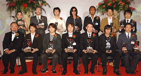 受賞者全員で──。 会場にはゲームクリエイター、業界各関係者をはじめ、