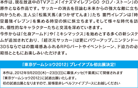 株式会社レベルファイブ(本社:福岡市中央区、代表取締役社長/CEO:日野晃博)は、国内外シリーズ累計510万本以上※を出荷している「イナズマイレブン」シリーズにつきまして、『イナズマイレブンGO2 クロノ・ストーン ネップウ/ライメイ』(対応機種:ニンテンドー3DSTM/ニンテンドー3DSTM LL)を2012年12月13日(木)に各5,500円(税込)にて2バージョン同時発売することを決定いたしました。