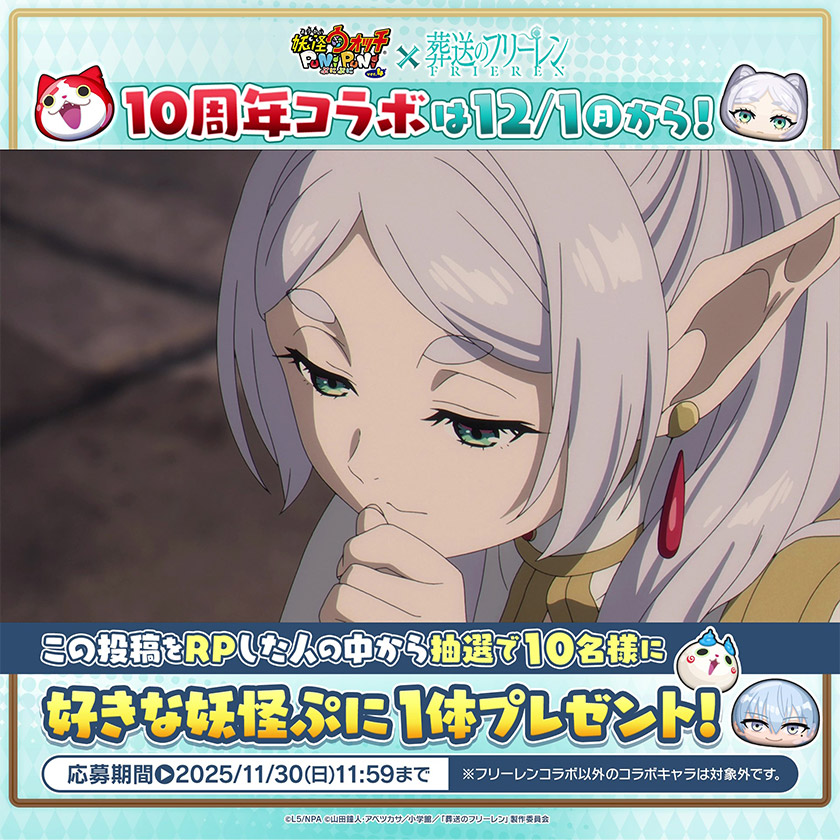 株式会社レベルファイブ(本社:福岡市中央区、代表取締役社長/CEO:日野晃博)とNHN PlayArt 株式会社(本社:東京都港区、代表取締役社長:丁佑鎭)は『妖怪ウォッチ ぷにぷに』10周年を記念して、12月1日(月)より、アニメ『葬送のフリーレン』コラボイベントを開催することをお知らせいたします。