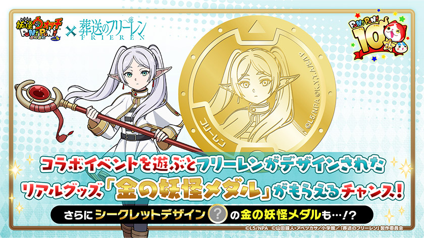 今回のコラボイベントでは、「フリーレン」がデザインされた「金の妖怪メダル」をプレゼントします。