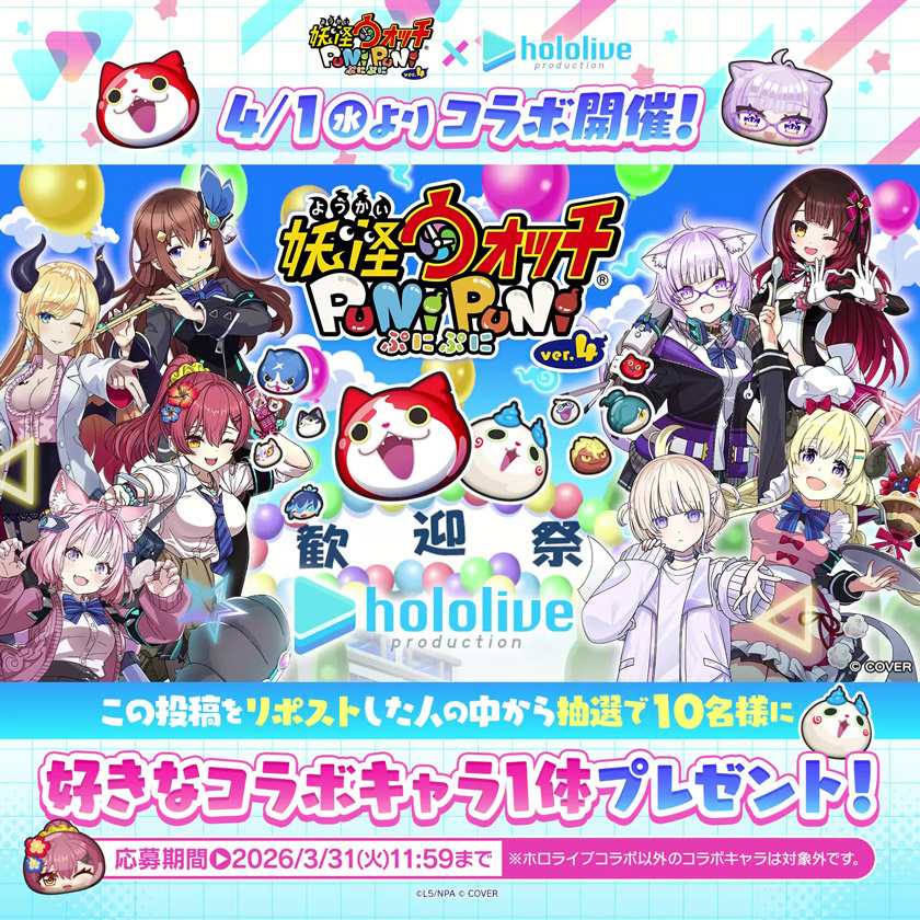 株式会社レベルファイブ(本社:福岡市中央区、代表取締役社長/CEO:日野晃博)とNHN PlayArt 株式会社(本社:東京都港区、代表取締役社長:丁佑鎭)は『妖怪ウォッチ ぷにぷに』において、4月1日(水)より、カバー株式会社(本社:東京都港区、代表取締役社長:谷郷元昭)が運営する「ホロライブプロダクション」傘下の女性VTuberグループ『ホロライブ』所属VTuberと『ホロライブ』コラボイベントを開催することをお知らせいたします。