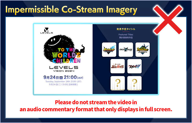 The Level5 online event, "LEVEL5 VISION 2024 TO THE WORLD’S CHILDREN" (hereafter referred to as "this presentation"), may be co-streamed (i.e., to simultaneously broadcast the livestream of this presentation for the purpose of viewing it with the audience while providing commentary,